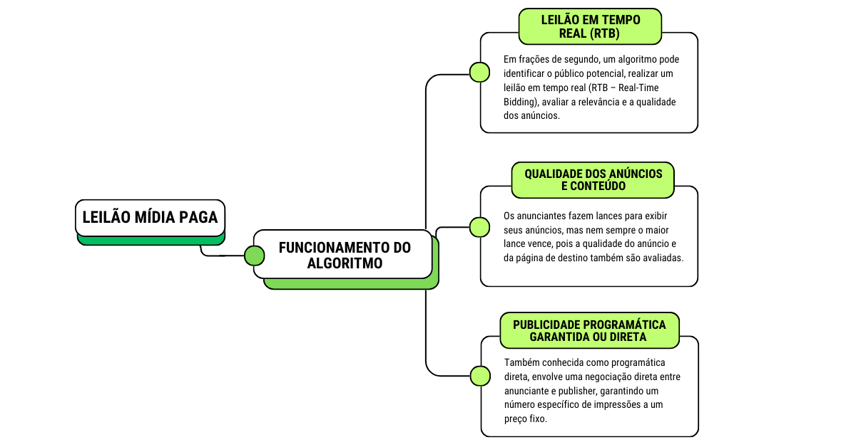 Os algoritmos desempenham um papel crucial na mídia paga, determinando onde, quando e para quem os anúncios serão exibidos. Em frações de segundo, um algoritmo pode identificar o público potencial, realizar um leilão em tempo real (RTB – Real-Time Bidding), avaliar a relevância e a qualidade dos anúncios. Com o tempo e a inserção de dados, os algoritmos refinam a segmentação do público, melhorando os resultados das campanhas.